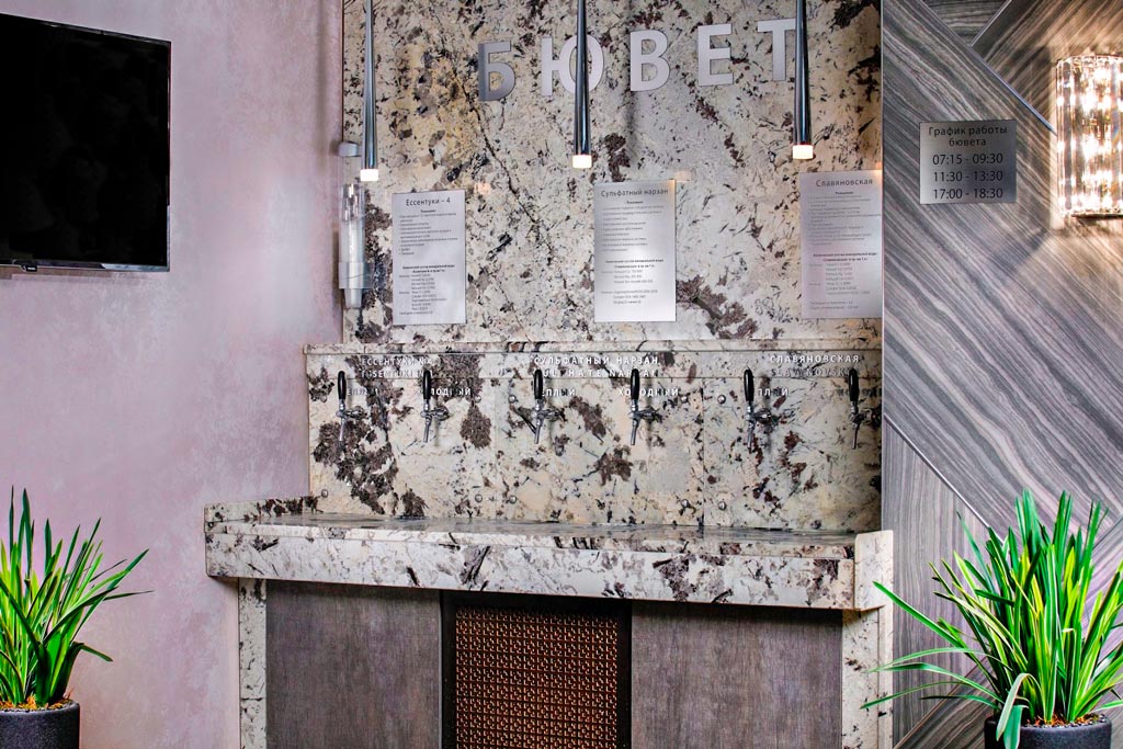 На территории санатория Арника в Кисловодске есть собственный бювет с несколькими видами минеральных вод – «Славяновская», «Нарзан» сульфатный, «Ессентуки – 4». В водах содержатся необходимые организму минералы, которые сложно восполнять в повседневной жизни – сера, йод, хром, литий, фтор, бром, магний, кальций. Их содержание оптимально сбалансировано между собой.